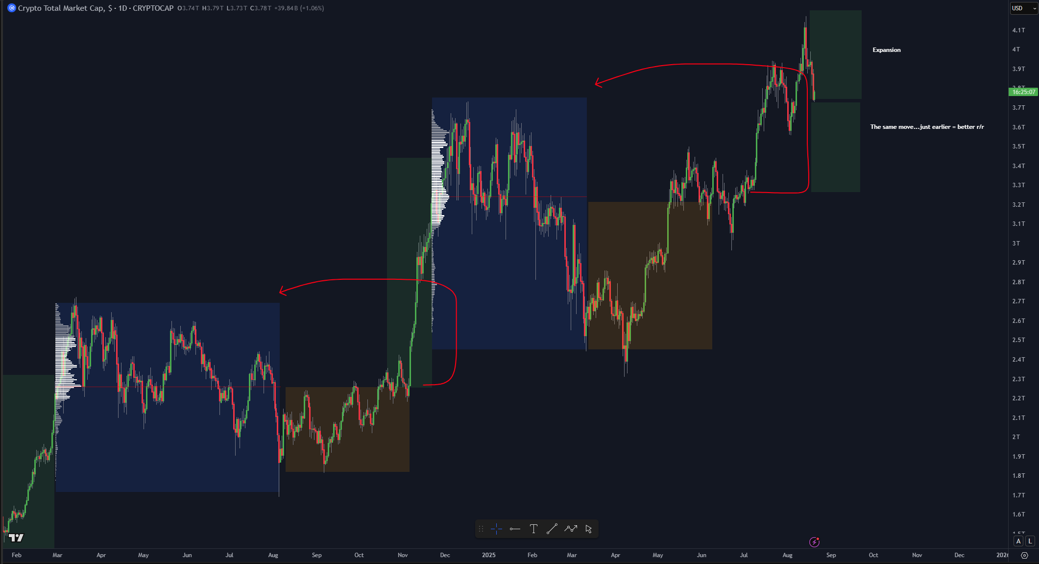 De volgende grafiek (link) van de totale crypto market cap illustreert dit duidelijk. Na een periode van consolidatie volgt een sterke uitbraak naar boven. Daarna ontstaat opnieuw een fase van opbouw, die vaak de basis vormt voor de volgende beweging.
